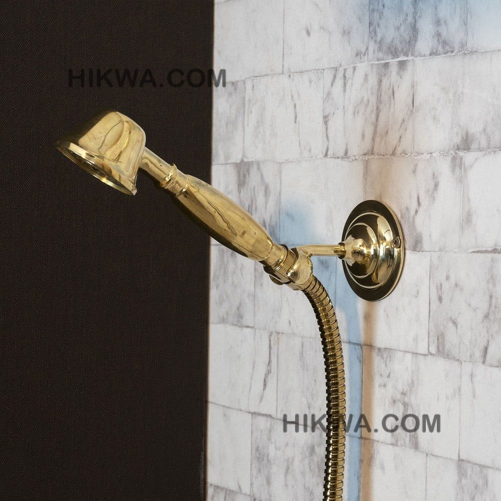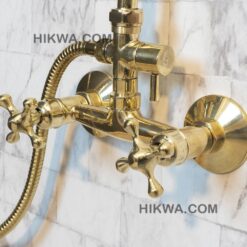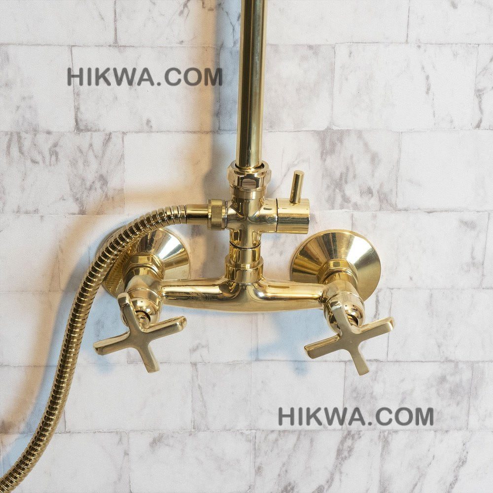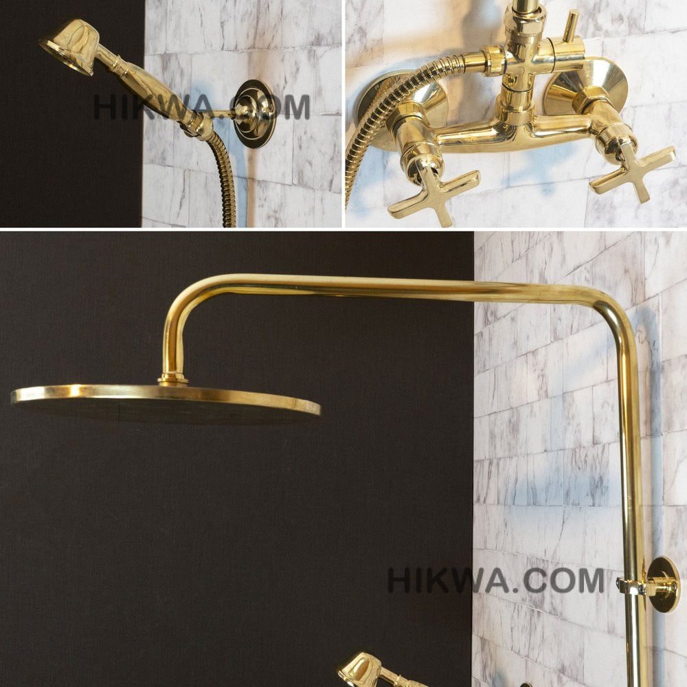Wash away the stress of your daily routine with an unlacquered brass shower system with a rainfall showerhead. Featuring classic cross handles and an exposed pipe, this timeless shower unit is made of solid brass.