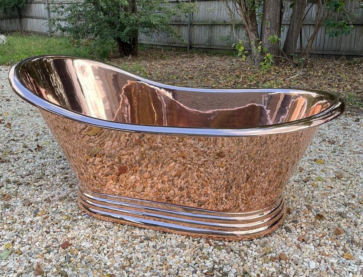Antique Copper Bathtub. This vintage-inspired, freestanding luxury tub is handmade from solid copper, offering both elegance and durability. Perfect as a centerpiece, our copper slipper bath provides a unique blend of timeless beauty and modern comfort.
