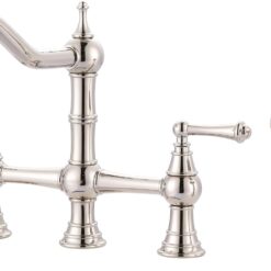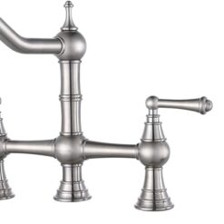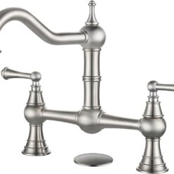 【Two Handles Kitchen Faucet】Bridge kitchen faucet features two handle design provides precise control over water volume and temperature. Plus, the high arc 360° swivel spout allows more space for kitchen tasks and makes it ideal for single and double sinks.