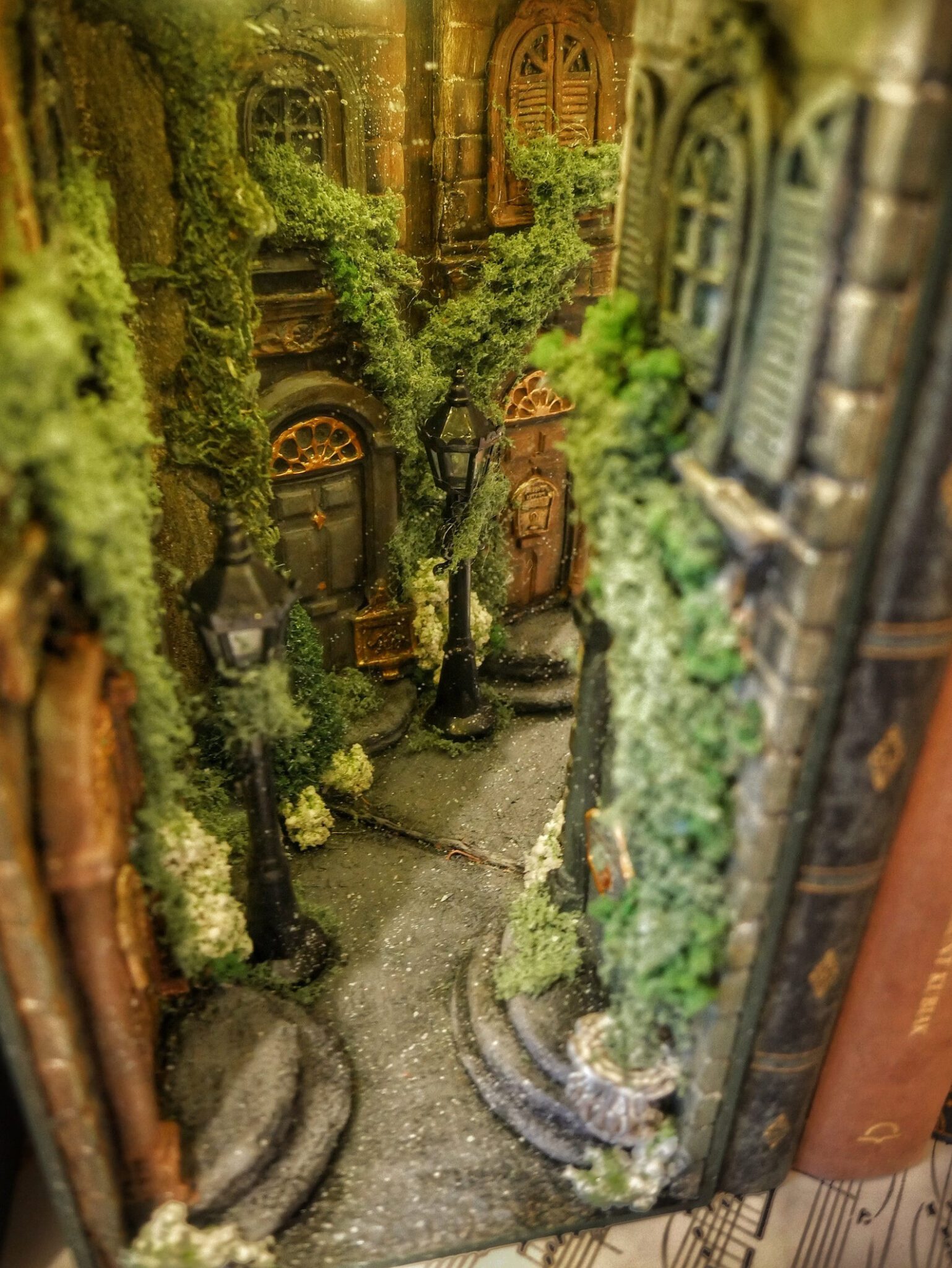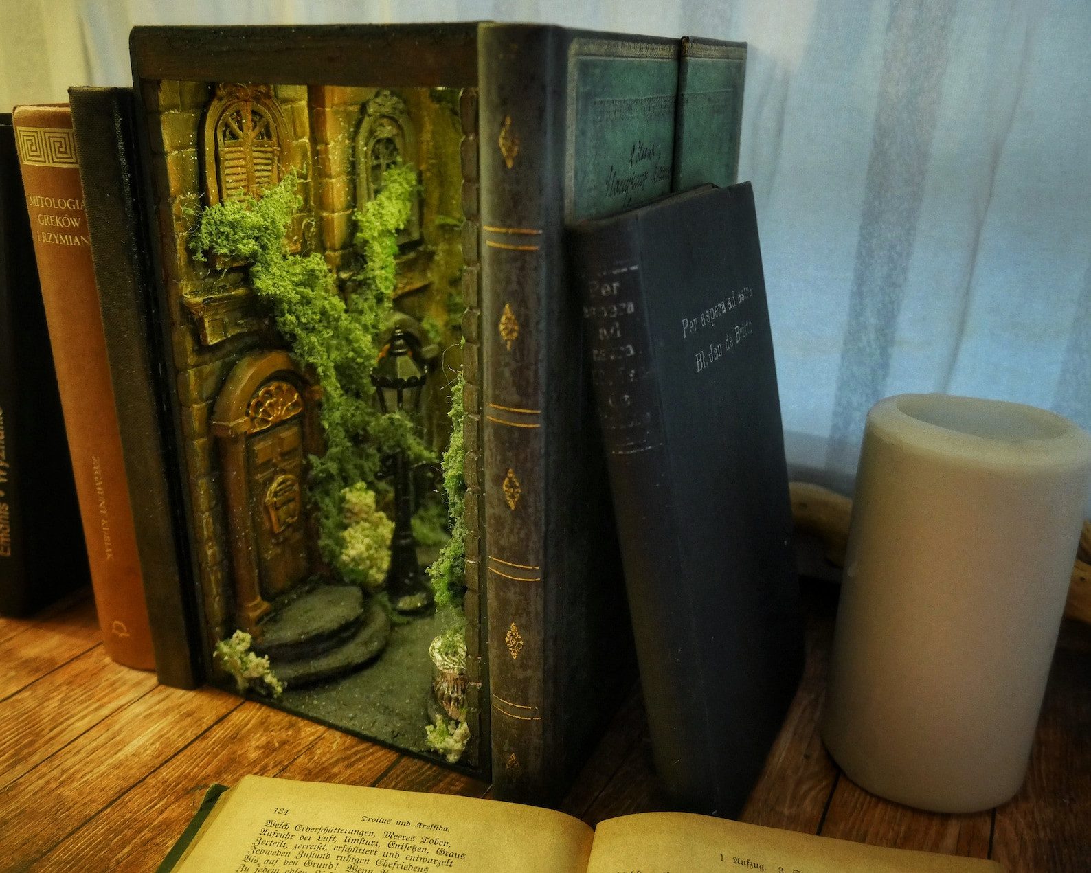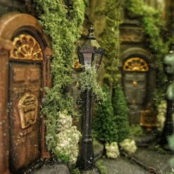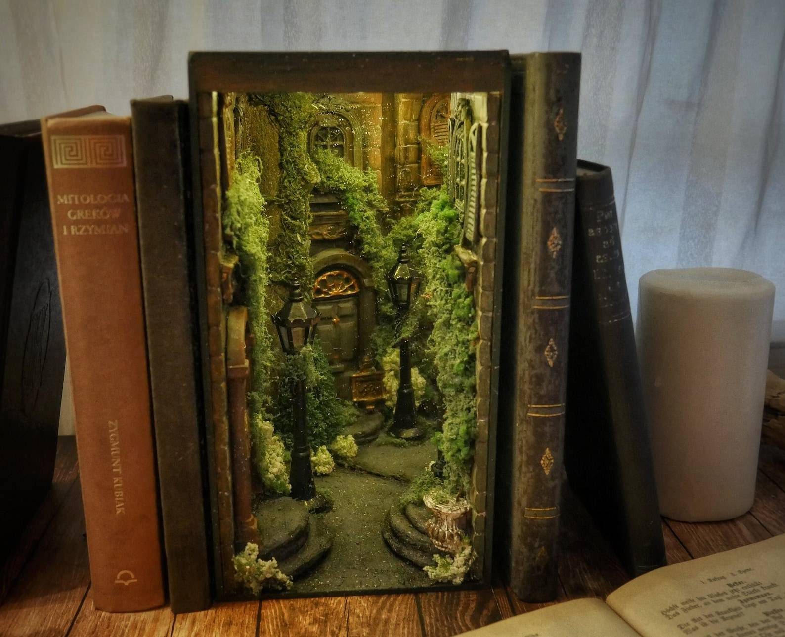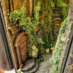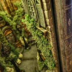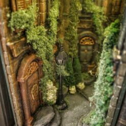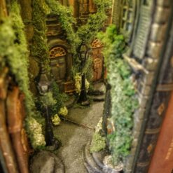 Alley at night, old buildings, covered with ivy. Abandoned, a bit dark place. The book nook has a mirror that makes the aisle feel like it never ends. Delicate light adds to its atmosphereBook nook is illuminated, has a short cable and batteries (not included) 3xAA.