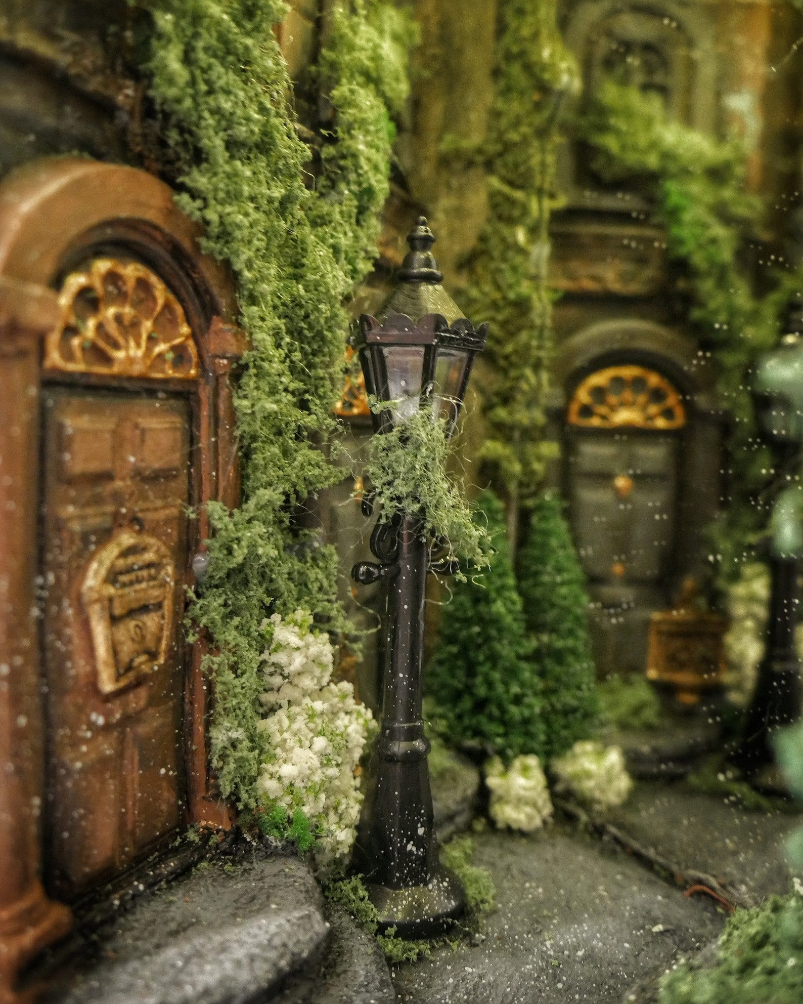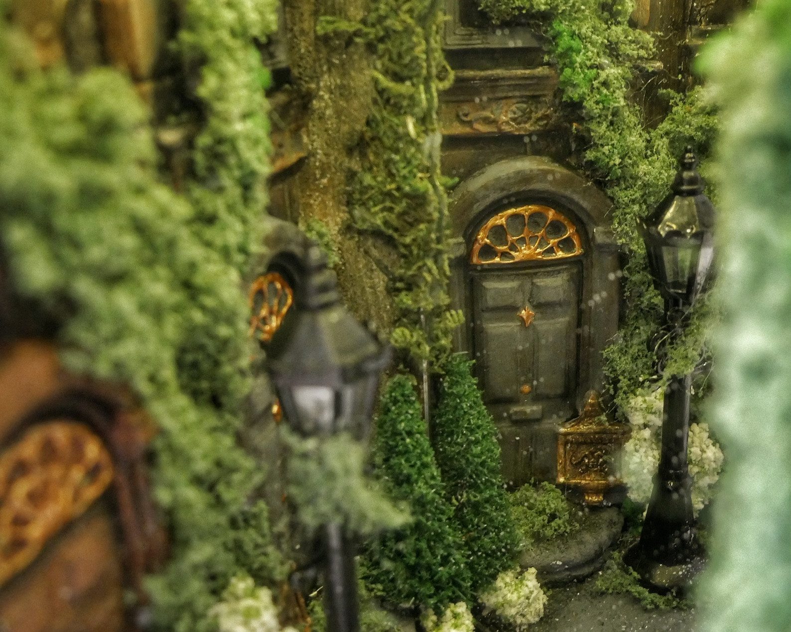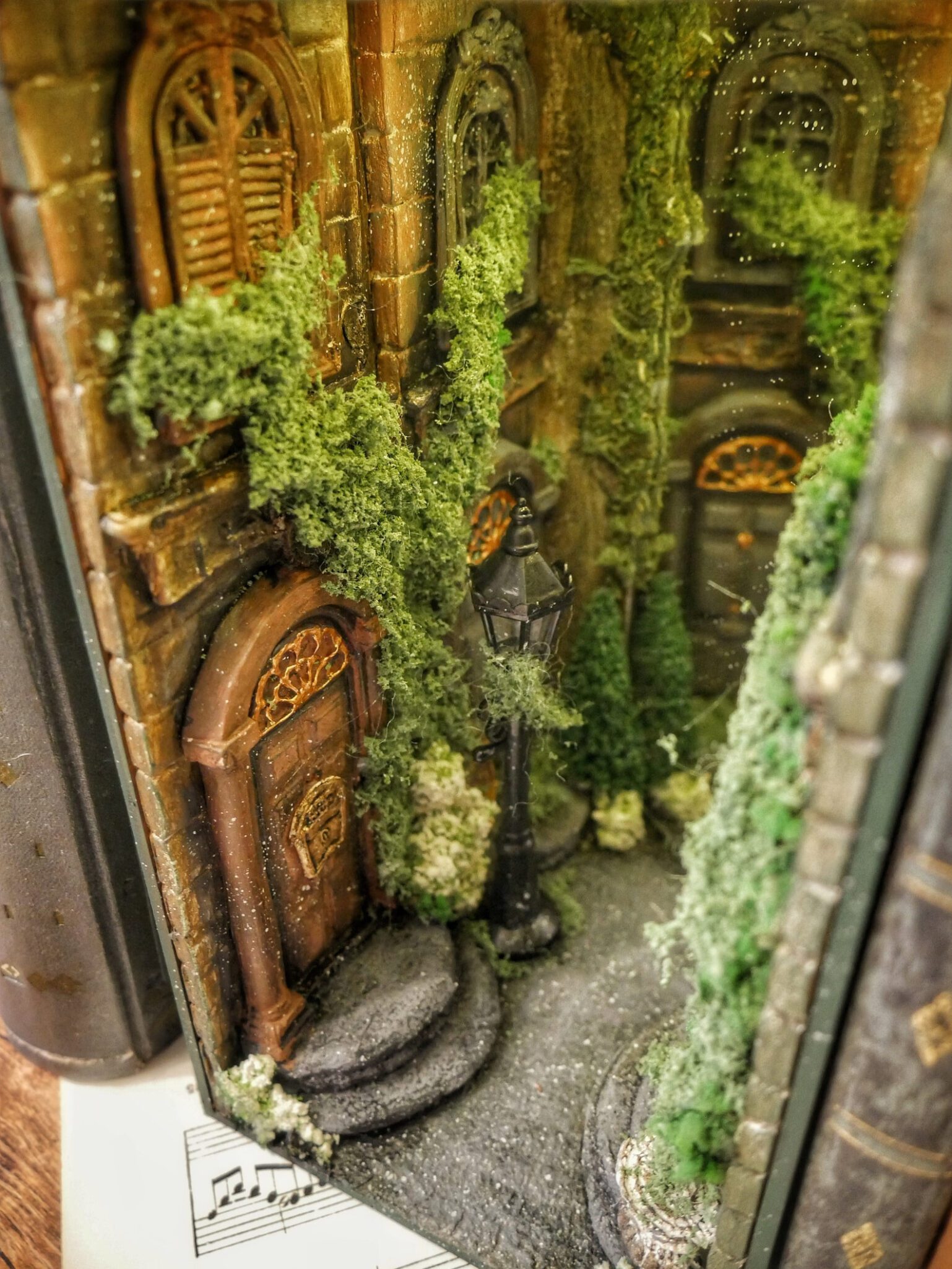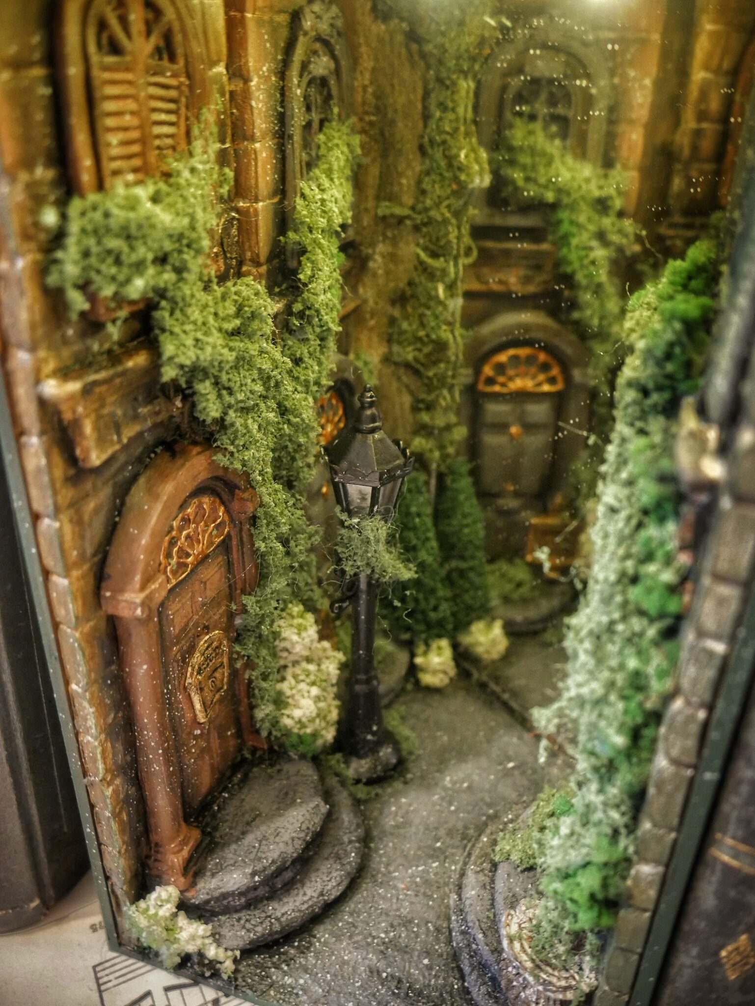 Alley at night, old buildings, covered with ivy. Abandoned, a bit dark place. The book nook has a mirror that makes the aisle feel like it never ends. Delicate light adds to its atmosphereBook nook is illuminated, has a short cable and batteries (not included) 3xAA.