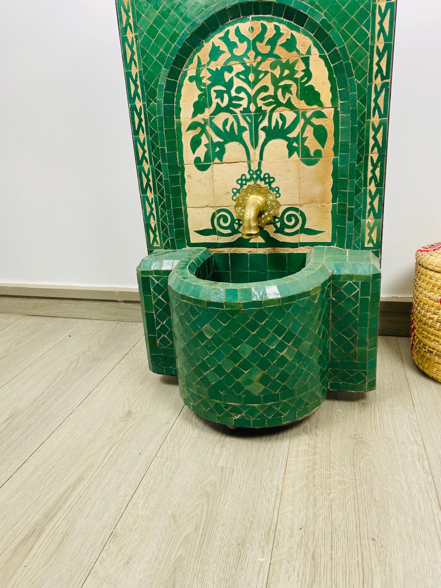 you will receive a wrought-iron base with wheels and you can chose a brass tap, together with the fountain, . This fountain is also particularly appreciated for hotels, terrace, restaurant , balcony, winter garden or garden , inside home ….. It is weatherproof . it’s includes a built-in pump.