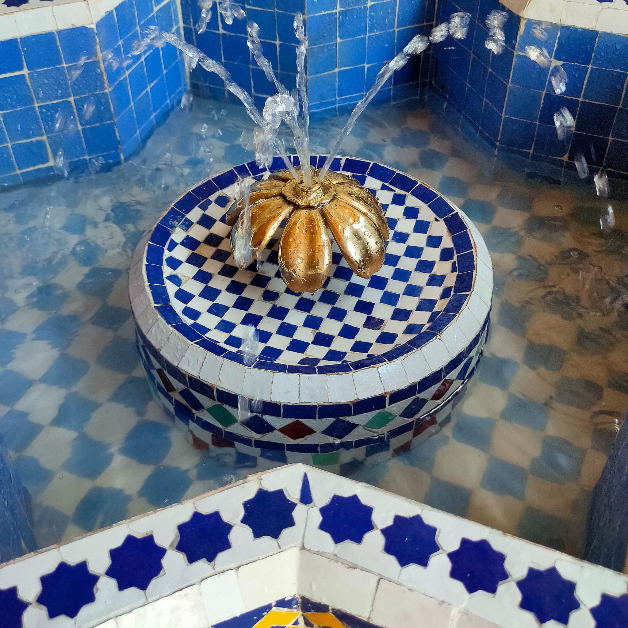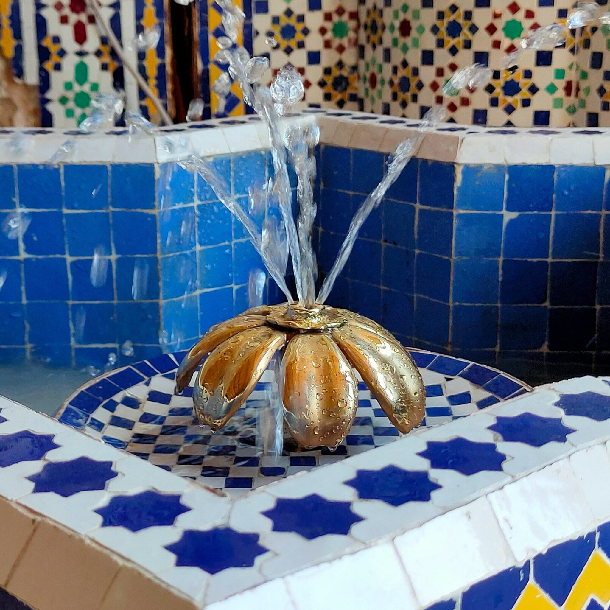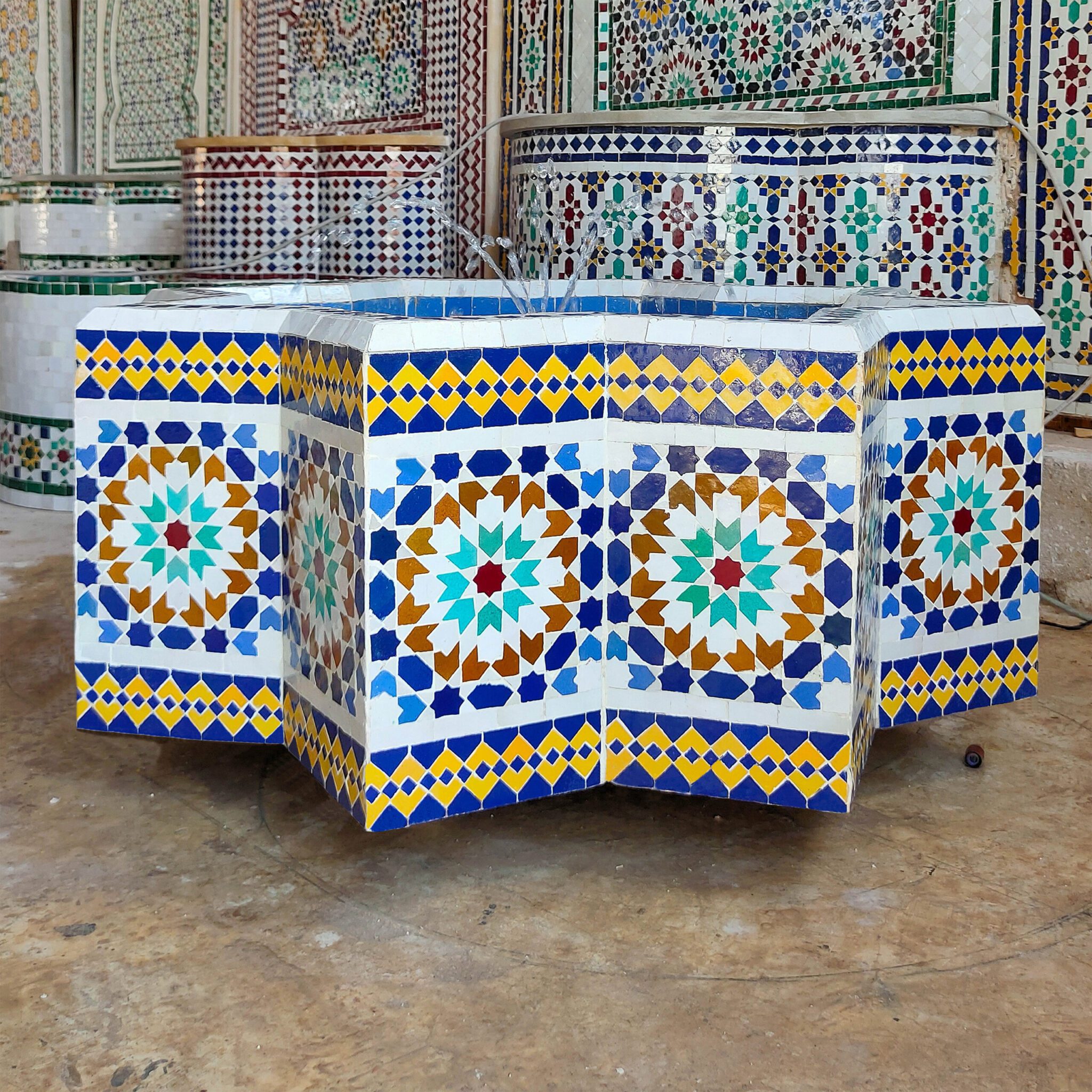 The story begins precisely in the area called Ben Jellik. Mountains of raw clay used in Zellige. After the clay is drawn out from the heart of the mountain and took to the four to give it the shape, the clay tiles are paint with colored glass in one of the two sides, then they are levelled and cut. The cutting is done in three phases: First is a form need to be drawn, whether we want triangles or squares or stars, then comes “Nequach” or the artisanal responsible of cutting it by hand by a sharp big hammer to give a perfect form to the clay, and finally they use a small hummer to sharp the edges. Then comes the artisan to start putting the individual hand-cut piece of tiles and start making the fountain, upside down which is magical, tells a lot about the expertise of the artisans. When he is done with the fountain, he adds the resin so the tiles stick together and he flips the fountain.