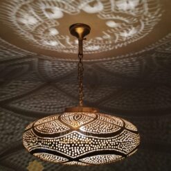 Handcrafted Moroccan Hanging Pendant Lights ceiling lamp is a versatile piece because it hangs well in your hallway or living room, among other things. Hand-perforated brass features bold floral designs throughout and when lit up this lamp throws a charming set of floral wheels across the space it inhabits.