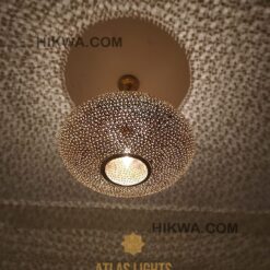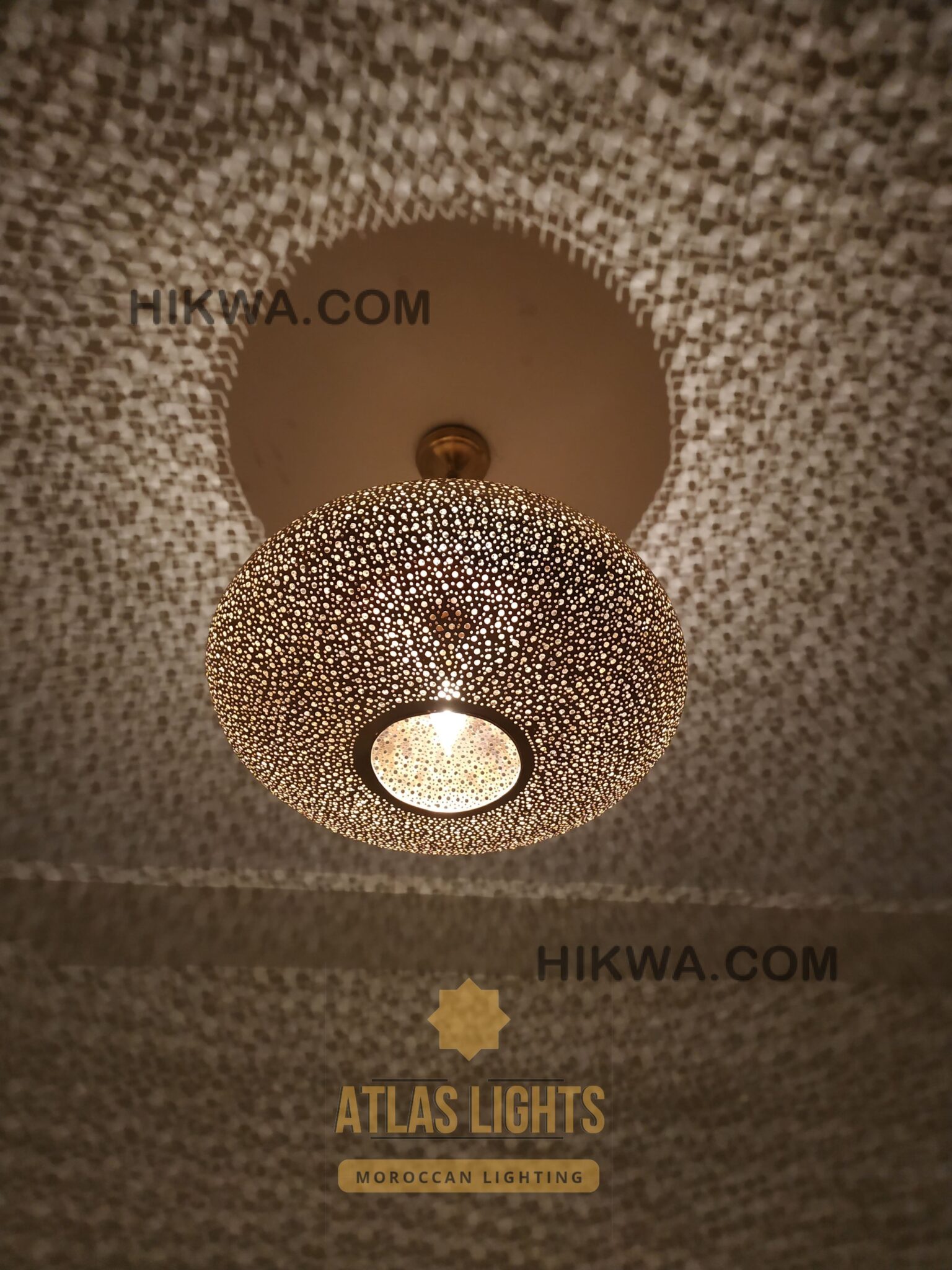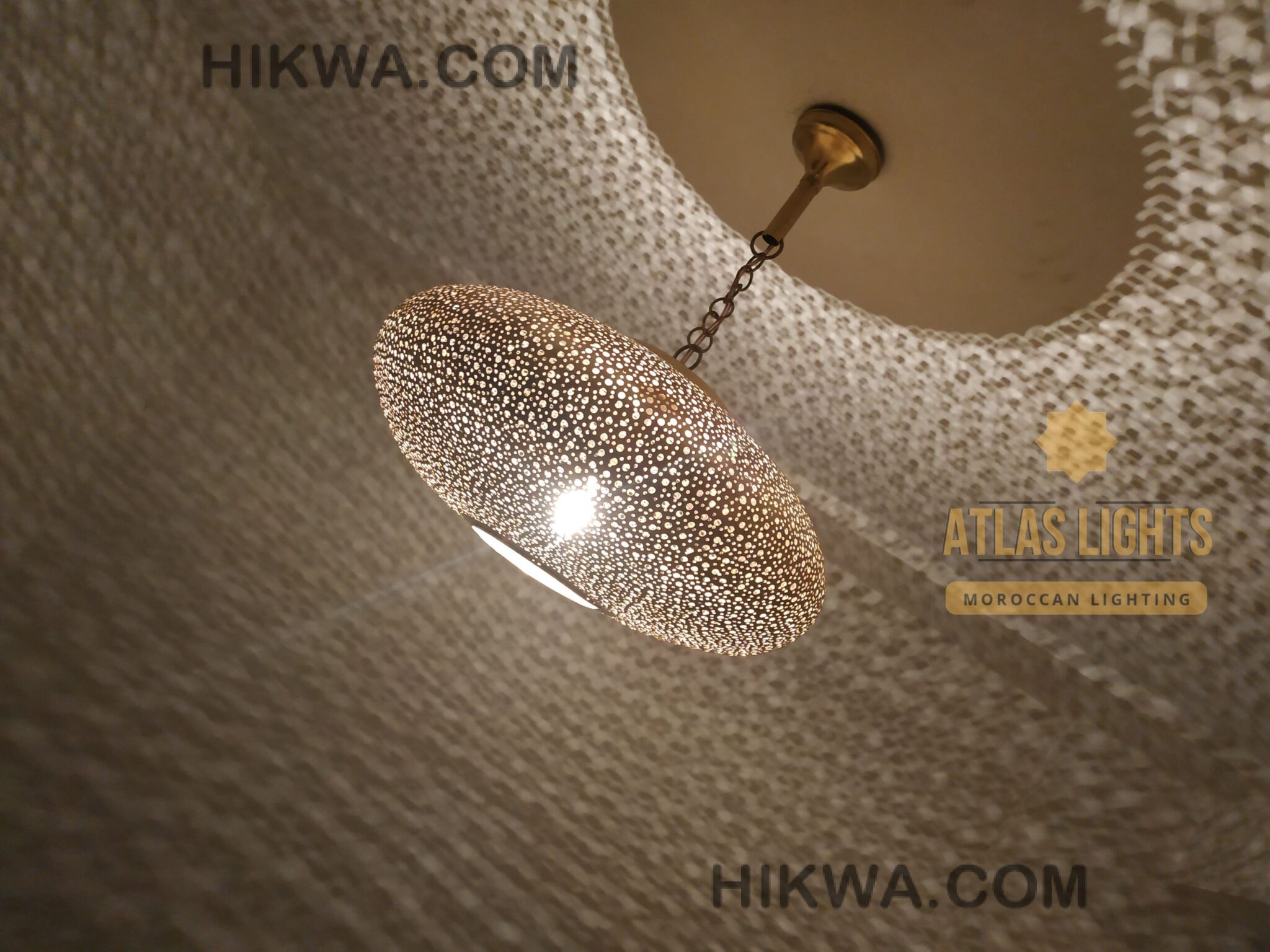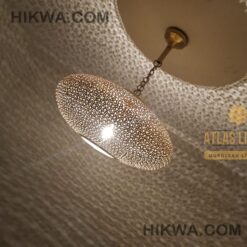 A suspension in the form of an open pressed ceiling lamp about 13.7″ and 21″ in diameter, which will add a touch of craftsmanship to your interior by diffusing a beautiful Moroccan lamp shades on the ceiling as well as the walls, and to illuminate the room.
